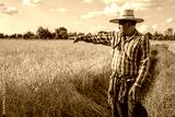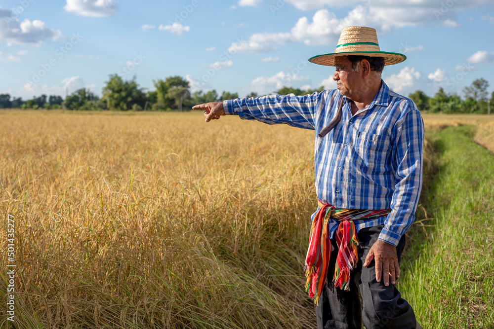 Elderly Asian farmers are looking at his rice field while pointing forward, rural lifestyle, Thailand