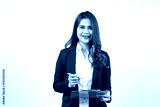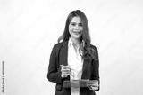 Smiling Asian young brunette business woman in black suit isolated on gray background studio. hold a pen with clipboard