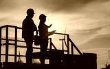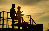 Silhouette of man and woman maintenance engineer team working in wind turbine farm. Generator station, renewable energy during at sunset.