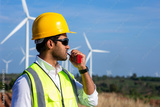 Young engineer wear protective helmet using radio communication in wind turbine farm on background.
