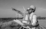 Two Asian technician engineers wear protective helmets holding blueprint working in wind turbine farm on background.