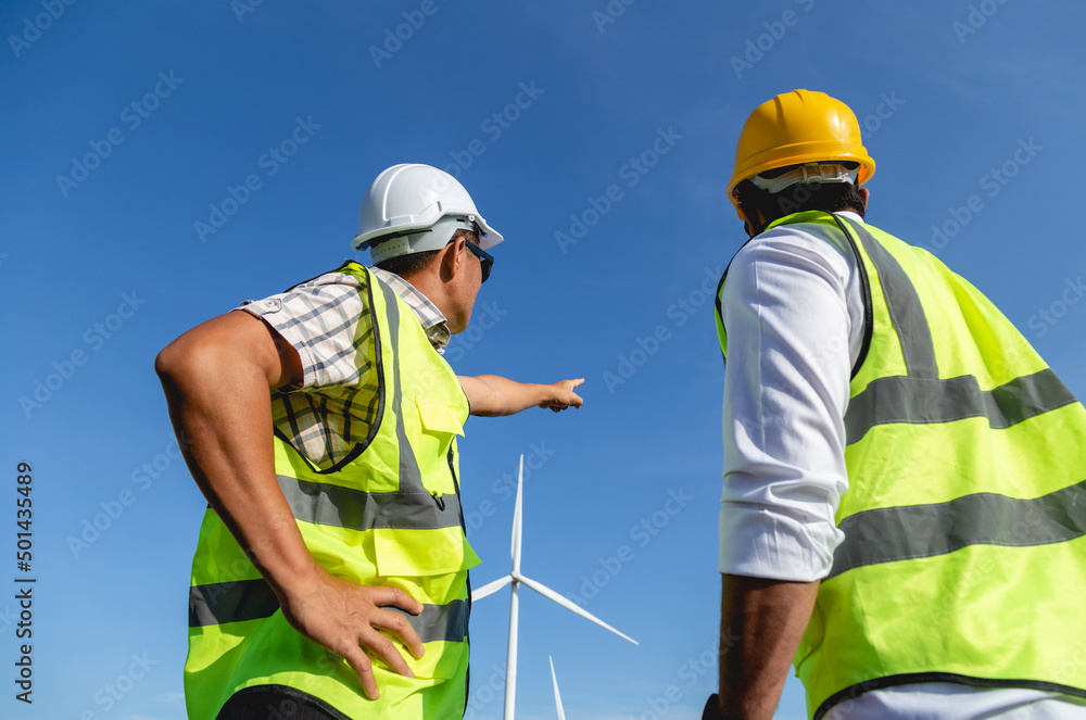 Back view of two Asian engineers discussing against turbines on wind turbine farm.