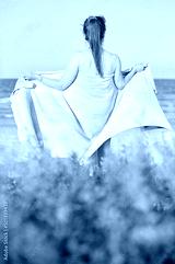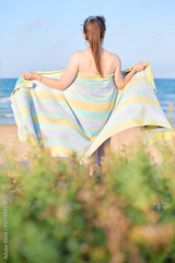 Summertime scenes. Young adult nude woman stands next to the shore on a nudist beach looking into the ocean on a summer sunny day while the wind waves her towel. Nudism concept.
