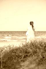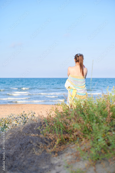 Summertime scenes. Unrecognizable young adult woman wrapped in a towel stands next to the beach shore looking into the ocean on a summer sunny day.