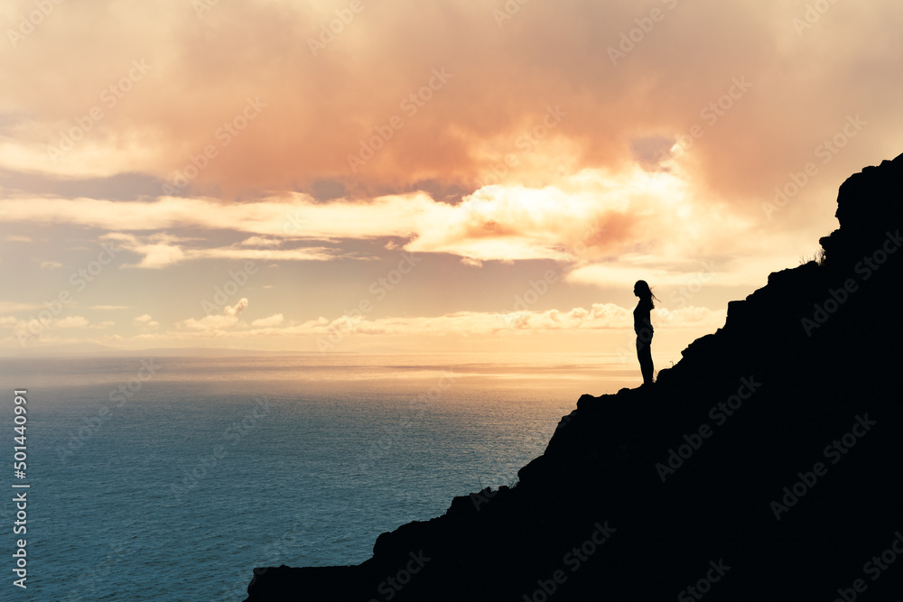 Woman standing mountain at sunrise. Travel Lifestyle emotional concept adventure summer vacations outdoor hiking mountaineering feeling at peace with nature
