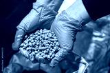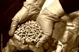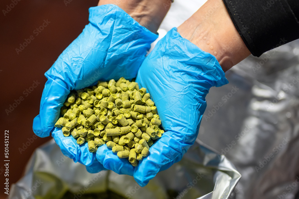 Pressed hop pellets are in the hands. Hands are dressed in blue rubber gloves.