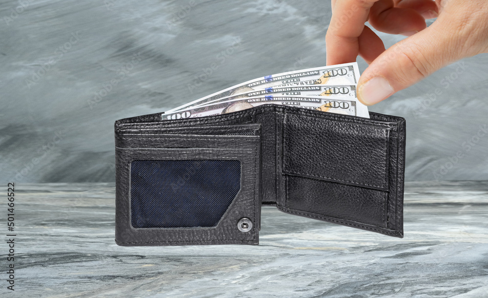 Black leather wallet with money