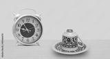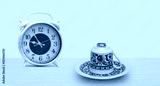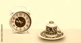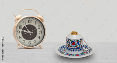 Turkish coffee cup on wooden table. Preparation for coffee fortune telling. The gold ring that sits on the hot cup for quick cooling.