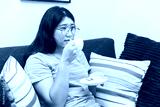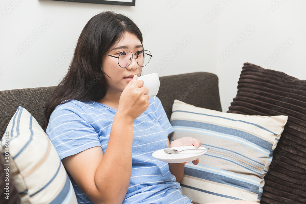Asian teen woman relax holiday at home watching news television at sofa drink hot beverage.