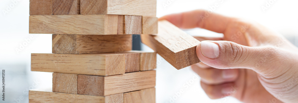 Business people play wooden games, divide the average investment value of a business and jointly manage risks, Alternative risk plan and strategy in business.