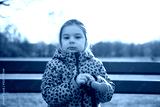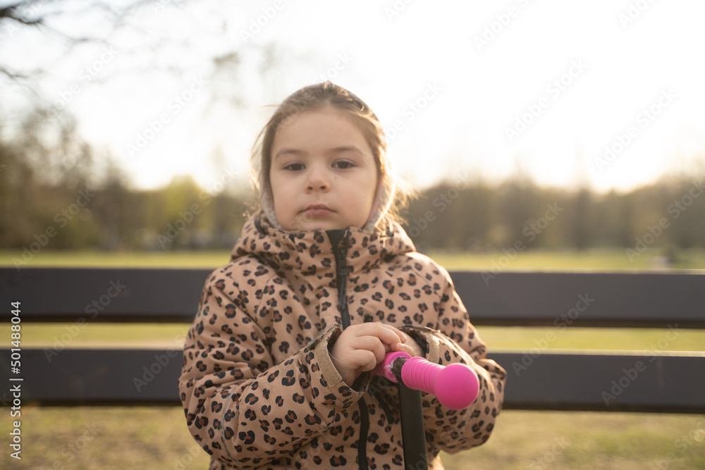 Caucasian preschool girl portrait with pink scooter in the park on sunny cold day in spring. Childhood activity outdoors