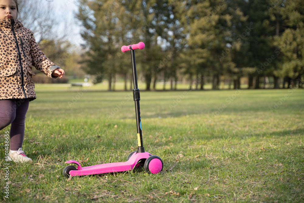 Caucasian preschool girl portrait with pink scooter in the park on sunny cold day in spring. Childhood activity outdoors
