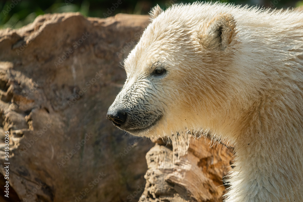 Portrait of a young polar bear in a zoo