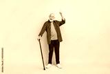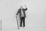Full size photo of good mood friendly grandfather recommend promote advert isolated on beige color background