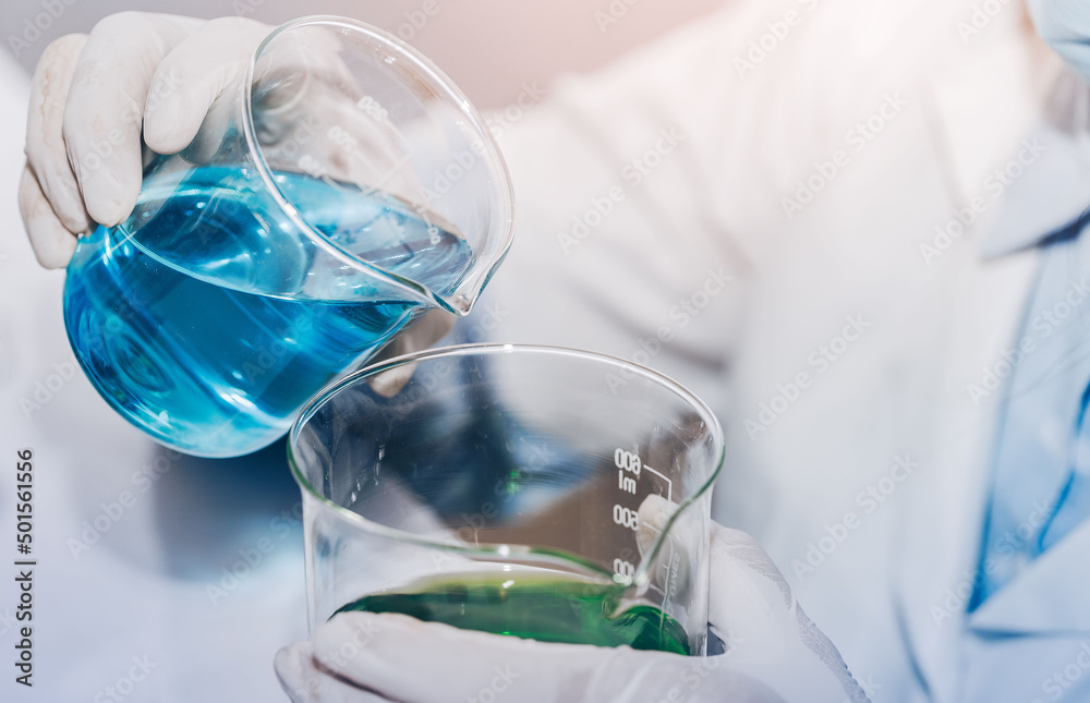 scientist with equipment and science experiments laboratory glassware containing chemical liquid. Health care researchers working in life science laboratory analyzing microscope slides in research lab
