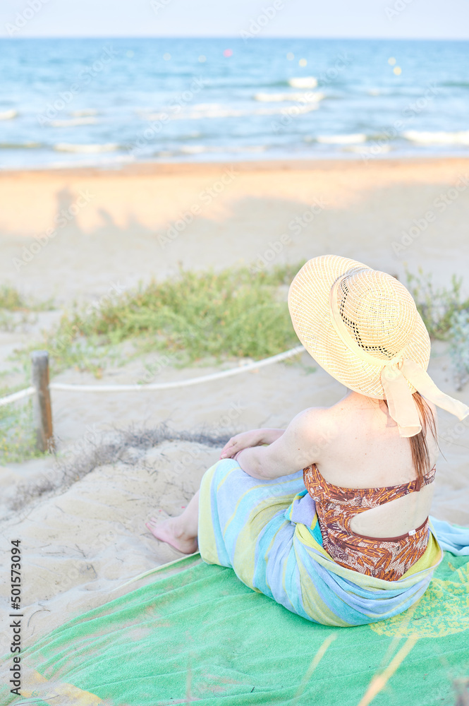 Unrecognizable young adult woman wrapped in a towel wears a hat sitting on the sand looking to the shore of a mediterranean beach. Summertime concept.