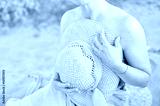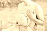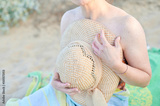 Unrecognizable young adult woman wrapped in a towel uses a hat to cover her breast in a nudist beach sitting on the sand in front of the shore of a mediterranean beach. Summertime concept.