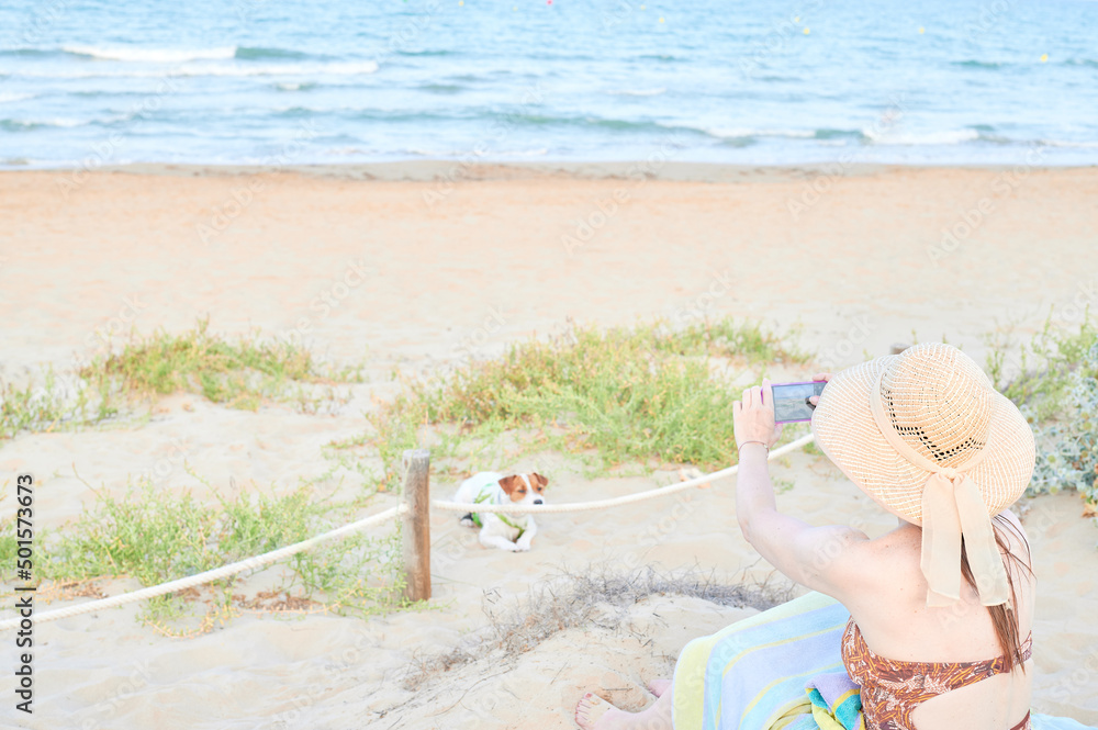 Young adult woman wears a summer dress and a hat while enjoys taking pictures of her dog sitting on the towel in front of the shore of a mediterranean beach. Summertime concept.