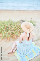 Young adult woman wears a summer dress and a hat while enjoys a cup of coffee sitting on the towel in front of the shore of a mediterranean beach. Summertime concept.