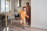Happy boy with down syndrome running and rejoicing while his mother blowing soap bubbles