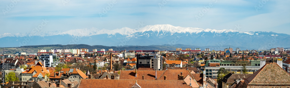 Panoramic view of the Sibiu city with snow covered Fagaras mountains in the back, part of the Carpathian mountains, Romania