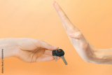 Man refusing to take a two keys on a yellow background. Business. Holding. Home. Contract. Property. Sell. Buyer. Access. Financial. Housing. Human. Rental. Seller. Own