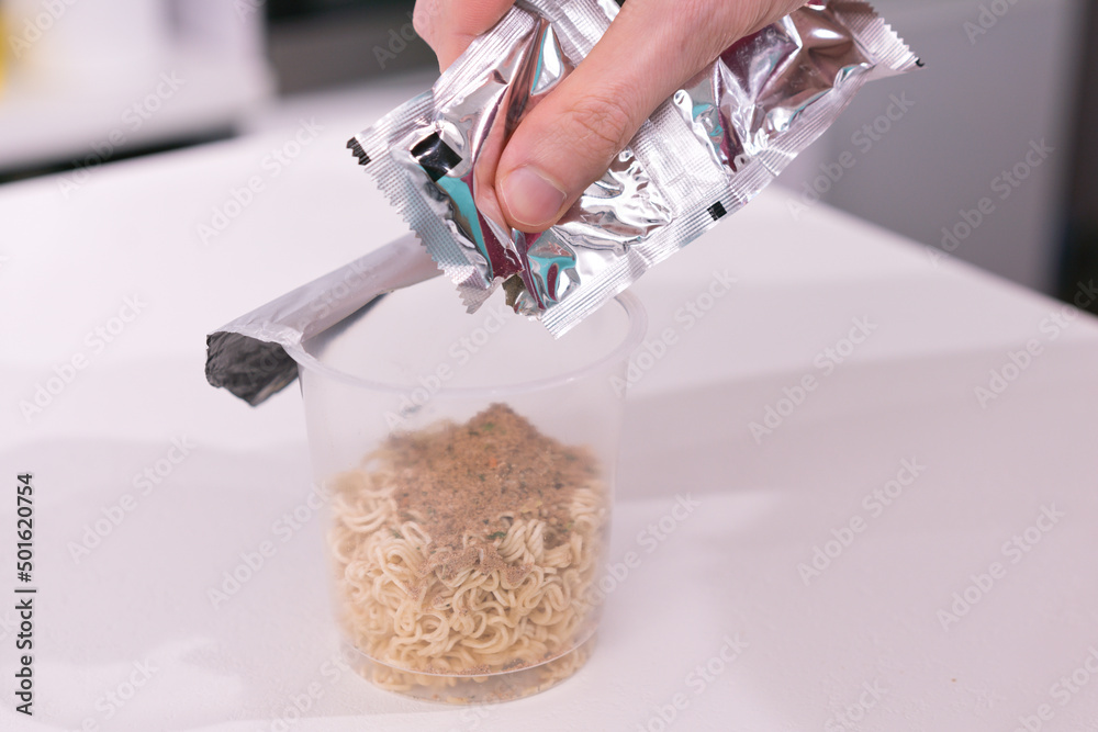 Man pouring dry noodles into a plastic cup. Flavoring. Nutrition. Cup. Blank. Plastic. Dish. Delicious. Preparing. Prepare. Food