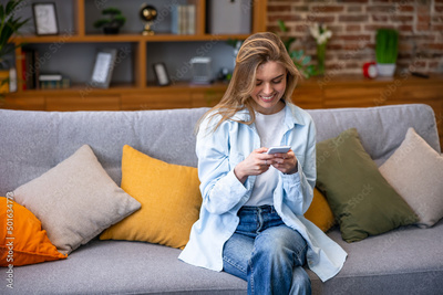 Smiling young woman using mobile phone app playing game, shopping online, ordering delivery relax on sofa.