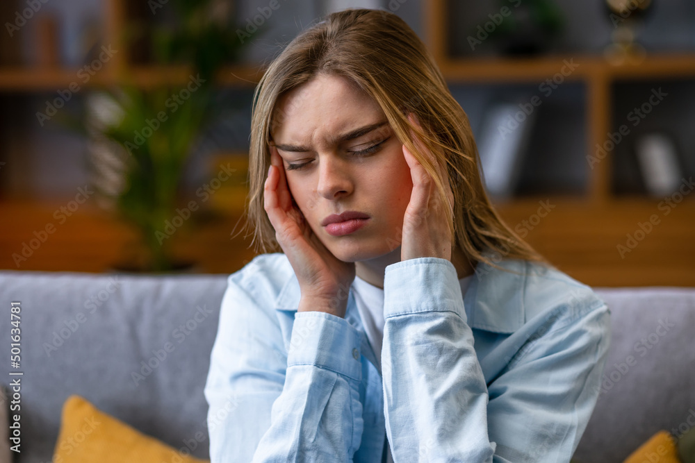 Headache. Close up photo of a young woman, who is sitting on the sofa with her eyes closed, touching her head while suffering from a migraine.