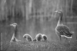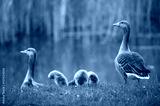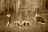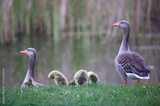 Eine Familie Graugänse mit ihrem Nachwuchs an einem Teich.