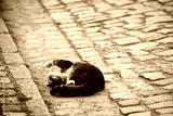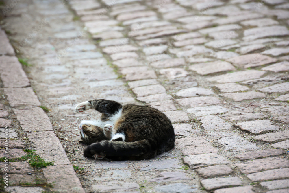 Eine getigerte Katze fühlt sich wohl und rollt sich auf der Straße.