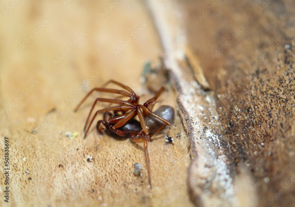 Nahaufnahme einer Sechsaugenspinne. Sie ist eine Familie der Echten Webspinnen.