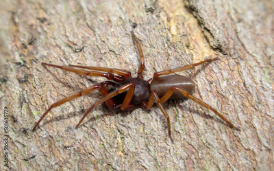 Nahaufnahme einer Sechsaugenspinne. Sie ist eine Familie der Echten Webspinnen.