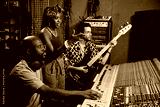 Mature African American music producer, young female singer and male guitarist working on song in recording studio