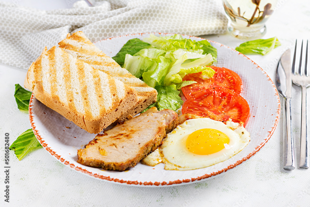 Fried egg with slice pork, tomatoes and toasts. Delicious English Breakfast. Brunch.
