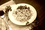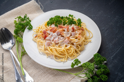 Spaghetti carbonara with Crispy Bacon and Ham on white plate on black background, Carbonara pasta with parmesan cheese and cream sauce, Traditional italian cuisine.cuisine.
