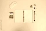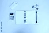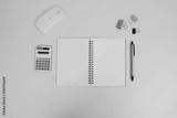 Office desk table with a laptop, notebook, and coffee cup, as well as other office supplies and equipment. The concept of business and finance. Flat lay with blank copy space at a workplace.