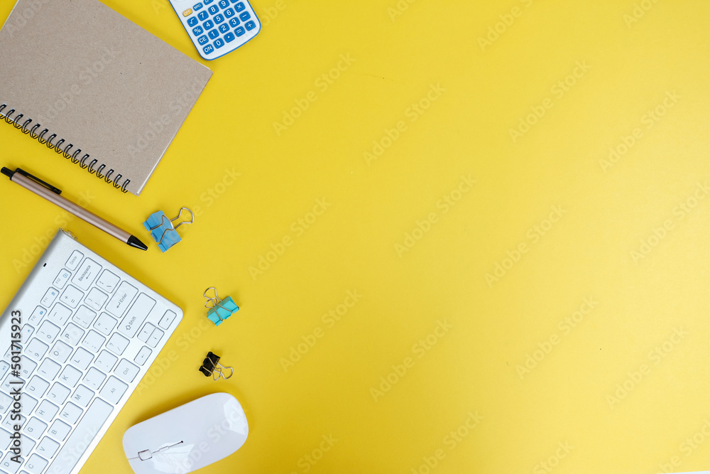 Top view of creative designer working desk with blank screen tablet, coffee cup and glasses on background. Top view with copy space for your text. Top view office desk table with blank notebook, coffe