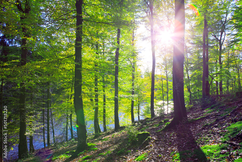 Summer beech trees on the sun and forest lake. Nature background.