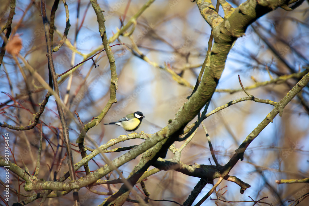 Portrait einer Blaumeise im Gestrüpp eines Busches.