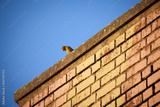 Ein Grünfink sitzt in der Abendsonne auf dem Simms eines Daches.