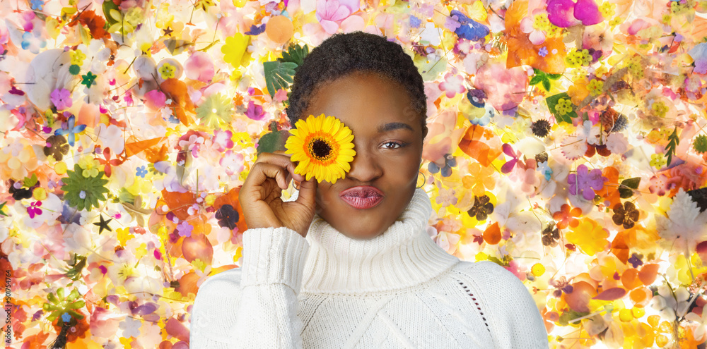 Portrait of a happy young woman holding yellow Gerbera daisy covering her eye with eyes closed