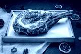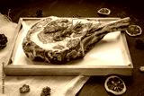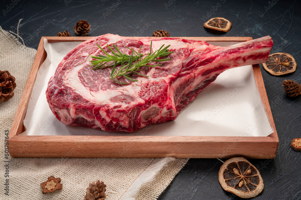 Fresh Tomahawk beef steak with rosemary on wooden plate, Tomahawk beef steak on black wooden background.