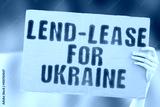 The phrase " Lend-lease for Ukraine " is on a banner in men's hands with a blurred Ukrainian flag in the background. Crisis. Democracy. Death. Document. Government. Nation. Heavy. Liberty. Rebellion