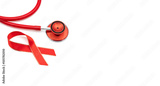 red stethoscope and red silk ribbon symbol of aids awareness on isolated white background