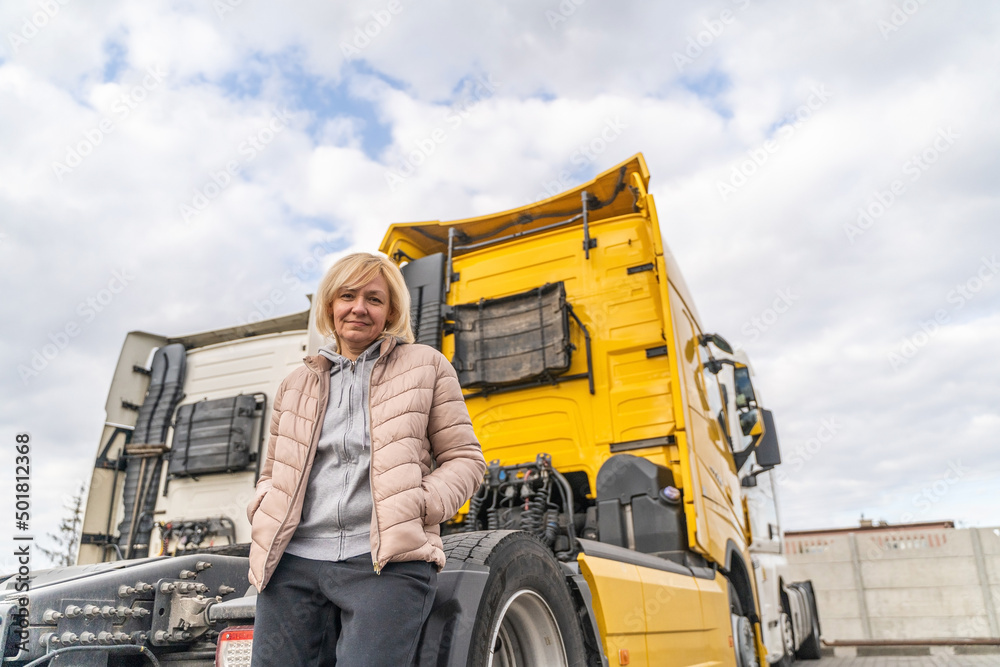 Caucasian mid age woman driving truck. trucker female worker, transport industry occupation
