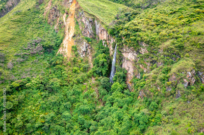 Ecuador Waterfall. Aerial view of mountain waterall in Vilcabamba, Ecuador. South America.