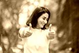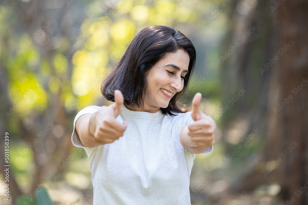 Cheerful mature indian woman wearing white t-shirt do thumbs up pose with both hands while standing in the park , Smiling urban asian female with positive expression. all the best. selective focus.