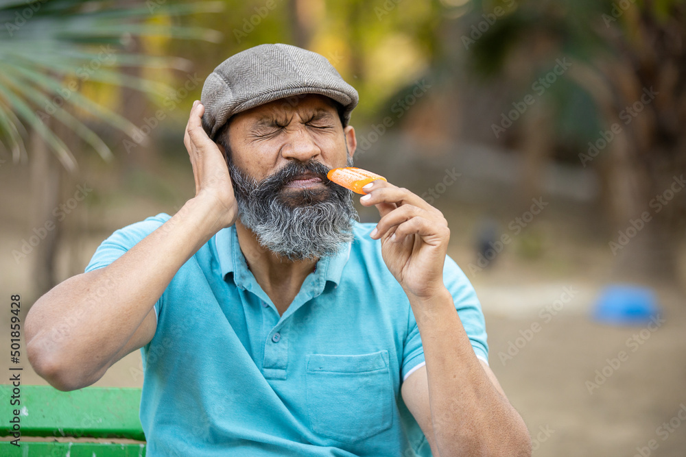 Indian senior man have sensitive teeth gum problem with ice cream Mature adult pain in mouth, Dental care.