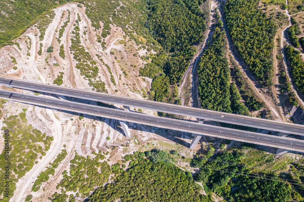 Aerial view on highway bridge in the mountain. Drone, copter view.